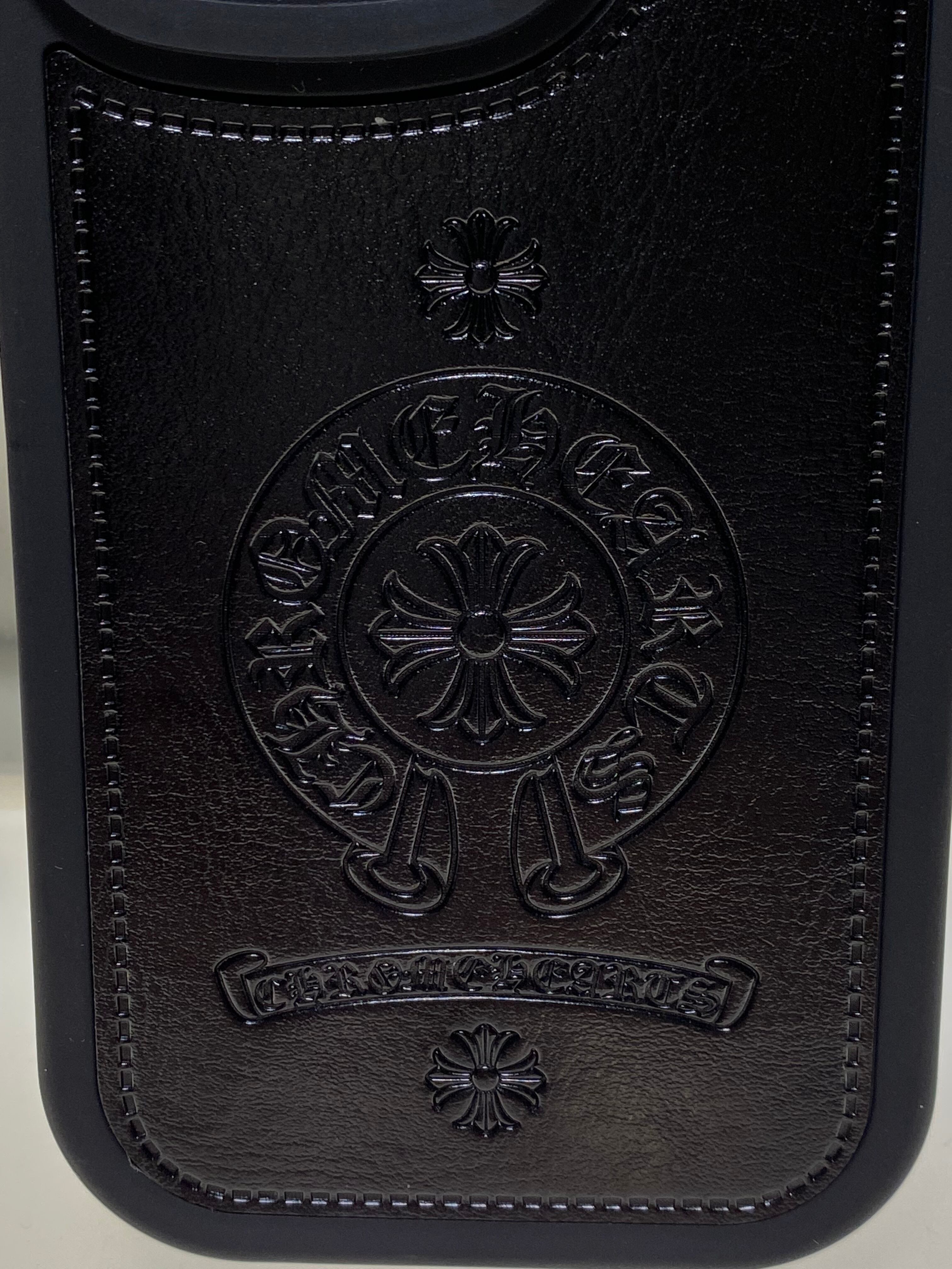 表面に貼られたPUレザーにホースシュー&クロスデザインが深く型押しされ、