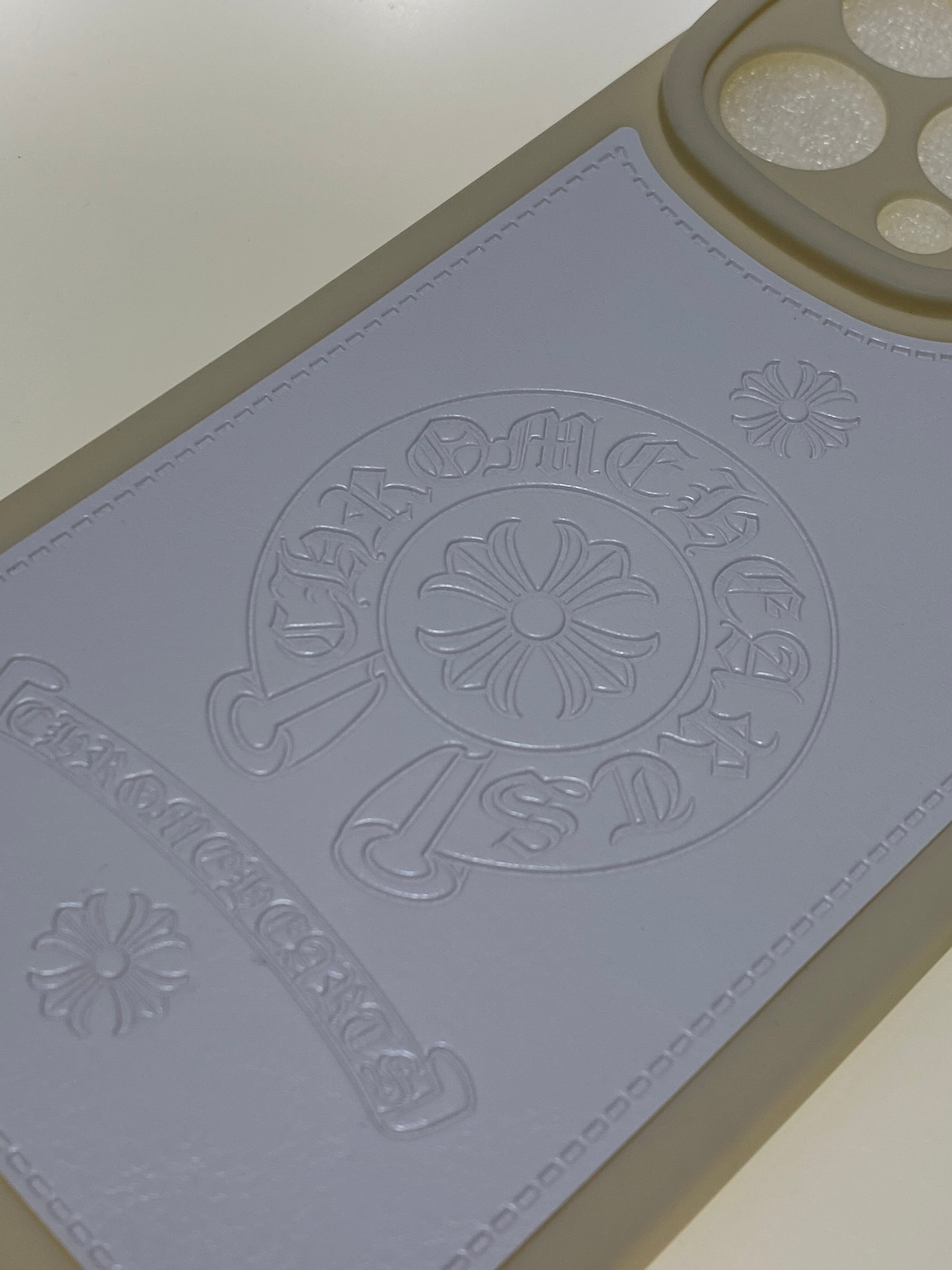 表面に貼られたPUレザーにホースシュー&クロスデザインが深く型押しされ、